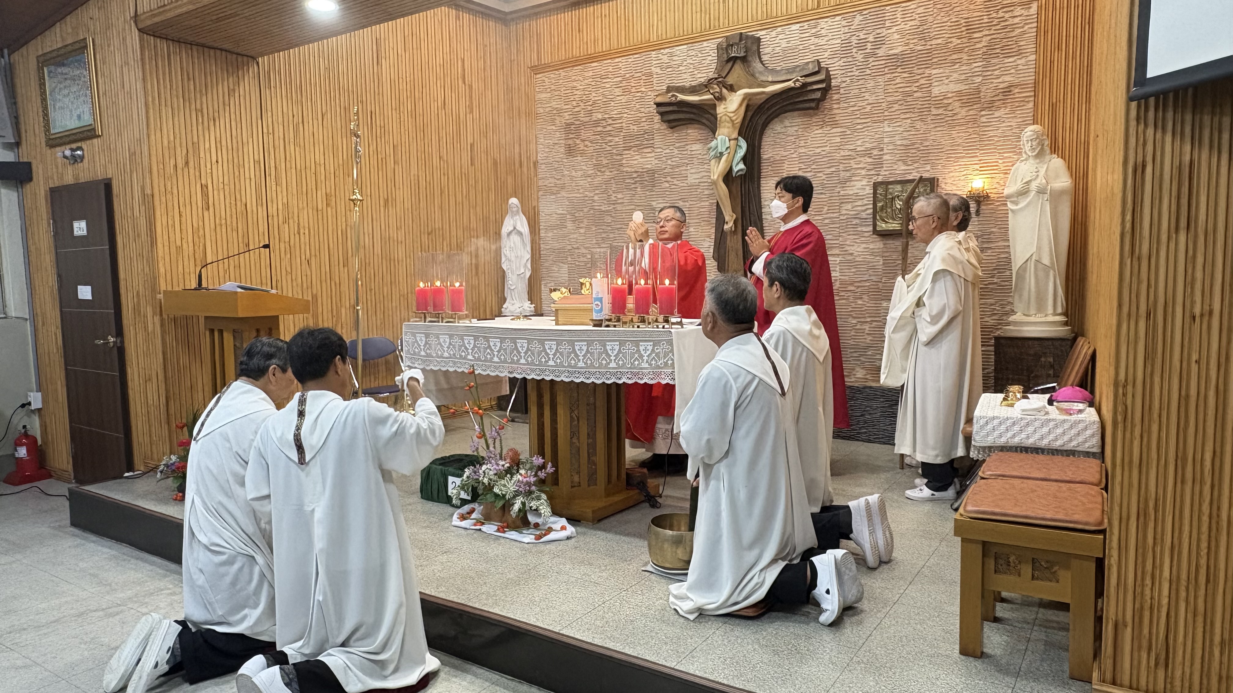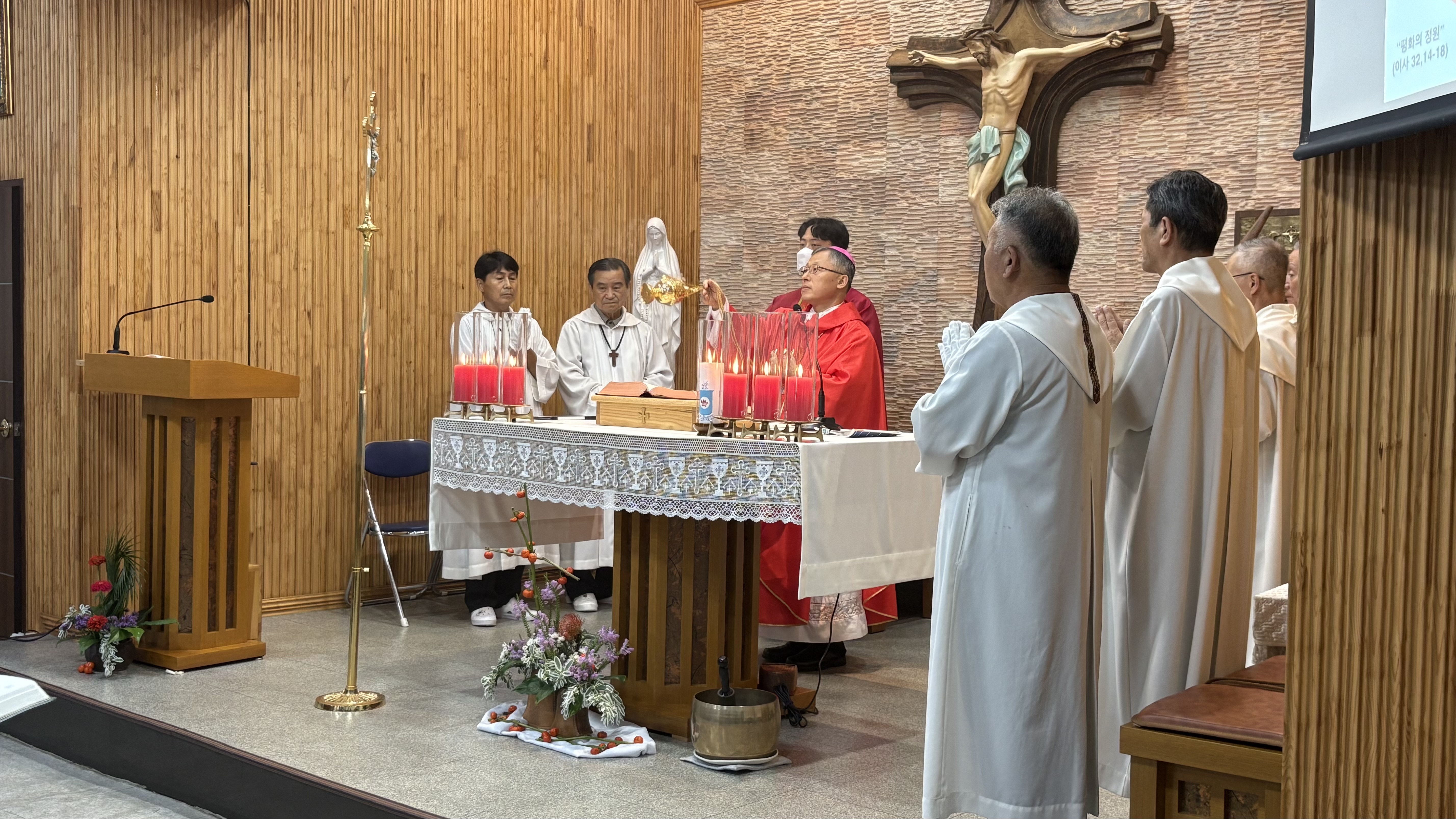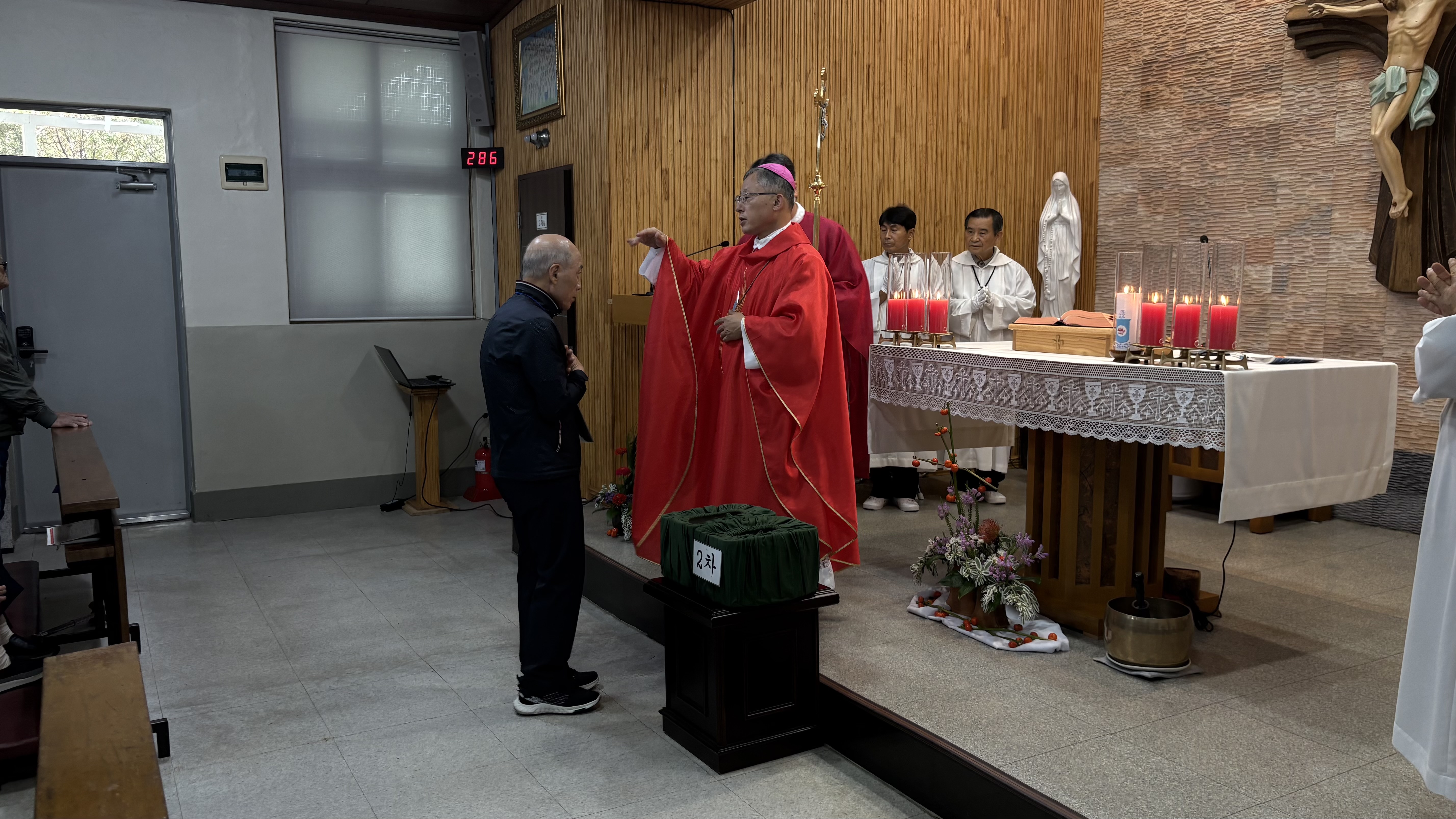 2025.9.21. 본당의 날(19일)을 맞아 김주영 시몬 주교님의 사목방문으로 공동체 미사가 거행되었다. 복사단이 보강되어 장엄하게 진행되었다. 사목회장도 복사단으로 봉사하였다. 주교님의 소박하고 멋진 강론에 이어 5명의 예비자 축복식도 있었다. 미사후에는 단체사진을 찍었는데, 미처 김병운 야고보 신부님께서 빠진가운데 진행되었다. 다시 찍어야 하는데 주교님께서 그냥 들어가 버리셨다. ㅠㅠ 나중에 뽀샵으로 추가하여야 할 것 같다. 그 후에는 본당의 날의 기념하는 식사 나눔이 이어졌다. 사실 주교님께서 3일간이나 오셨었는데 밥 한번 같이 먹지 몼했으니 오신 것도 아니다. 어쨌거나 주교님 사목방문은 샘밭성당이 사랑으로 하나되는 징검다리 역할이 되리라 확신한다.