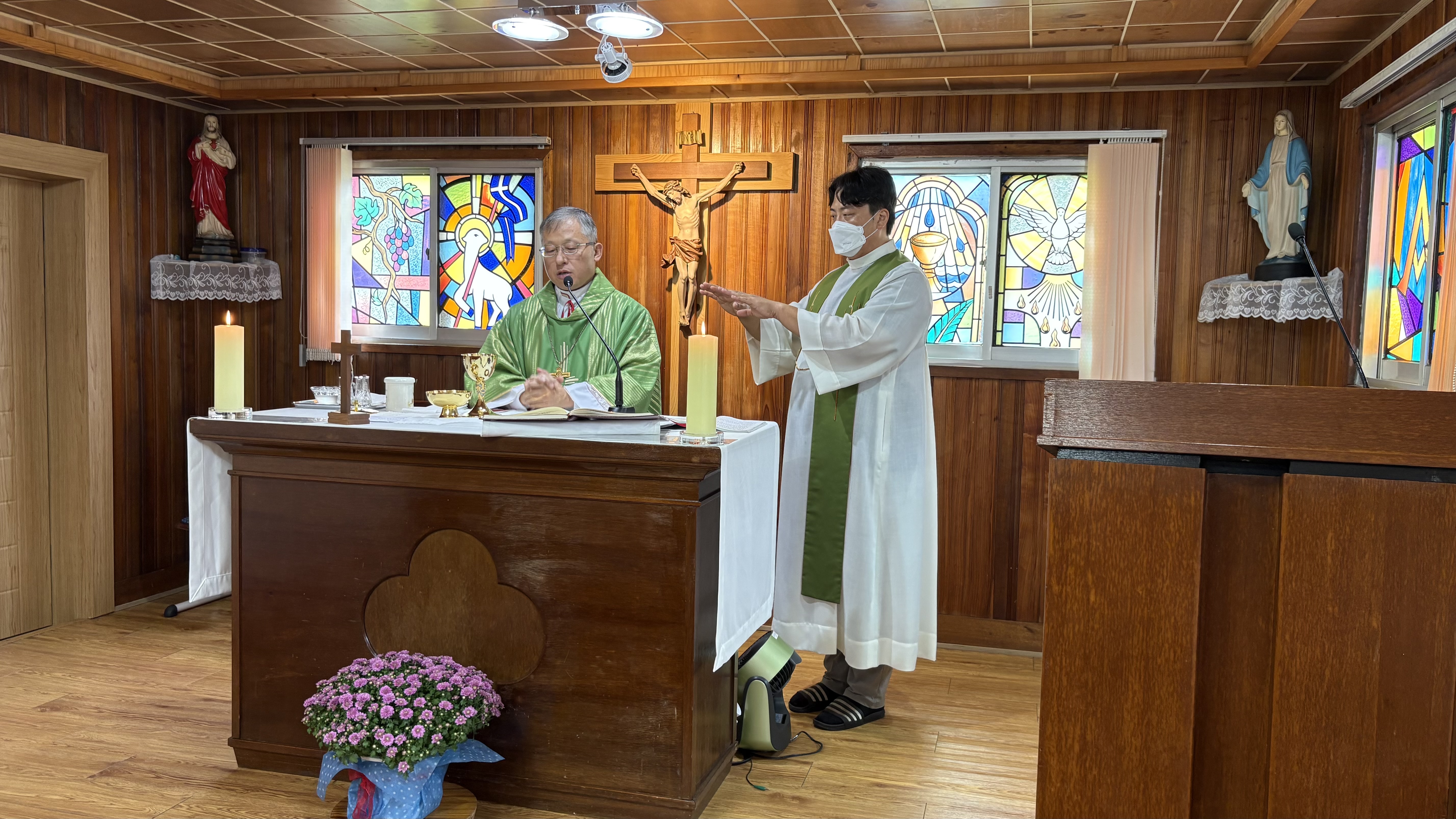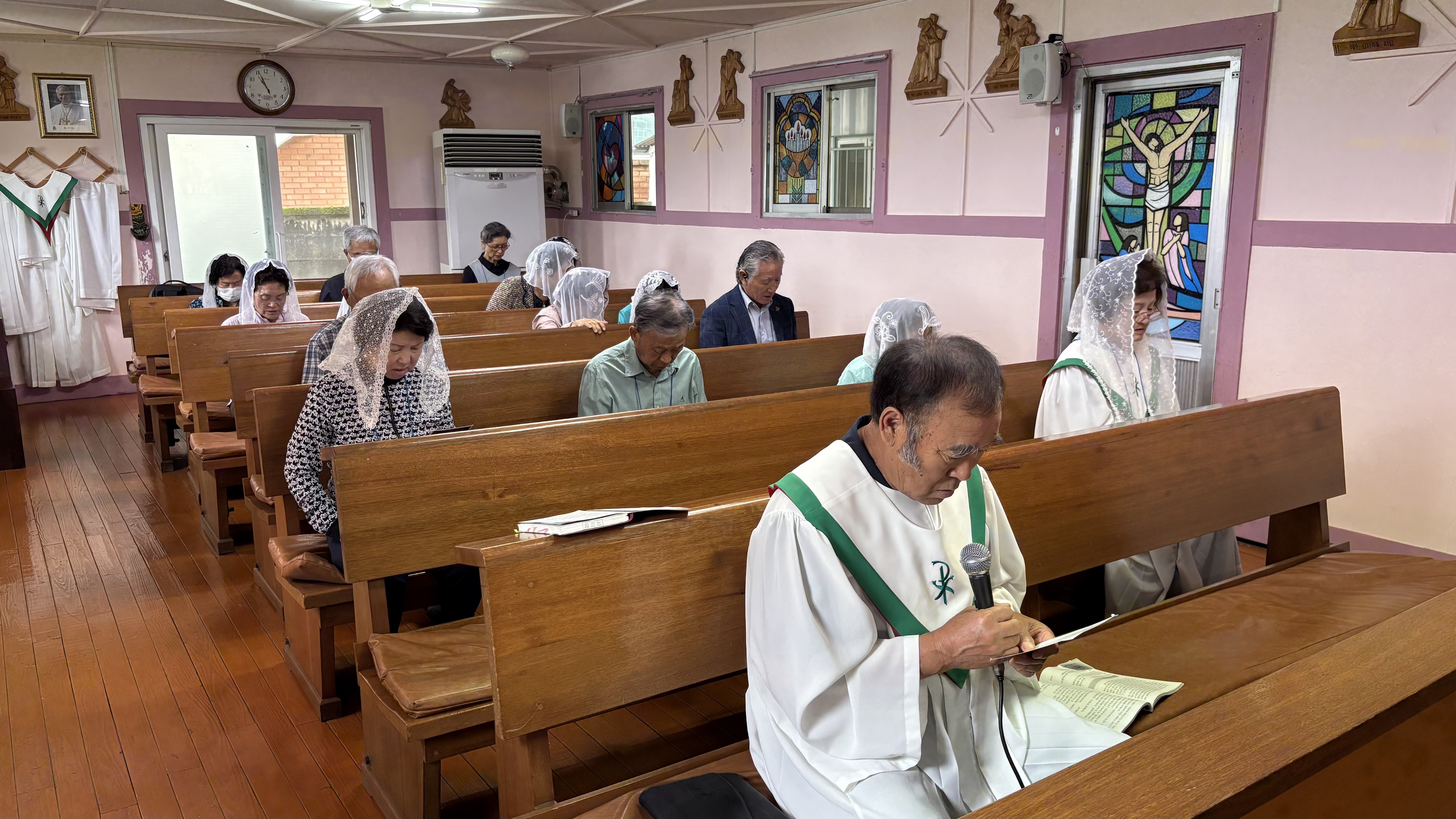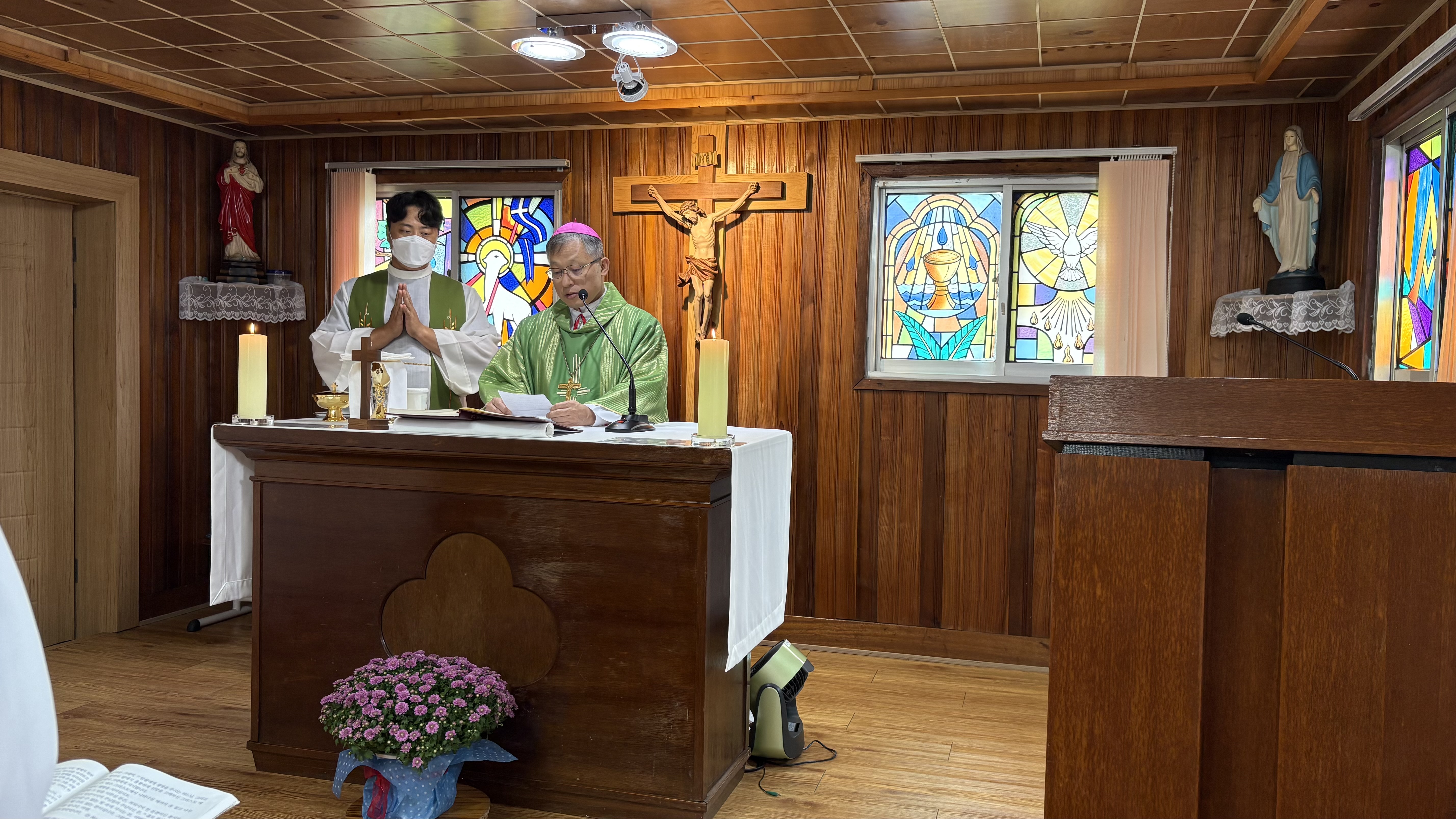 2025.9.20. 토요일 김주영 시몬 주교님께서 발산공소를 사목방문하였다. 미사는 김병운 야고보 신부님과 함께 집전하시고 이어서 발산공소 교우들과 간담회를 하였다. 일체의 음식은 물론 과일마저도 준비하지 말라고 하시고 만남의 방으로 이동하지도 않고 성전에서 간담회를 이어 갔다. 발산공소 교우들은 염소 우리에 둘러싸인 공소의 현실을 개탄하며 이전 신축을 건의하였다. 회의 이후 차를 나누고 성모상 앞에서 단체사진을 찍고 마무리하였다.